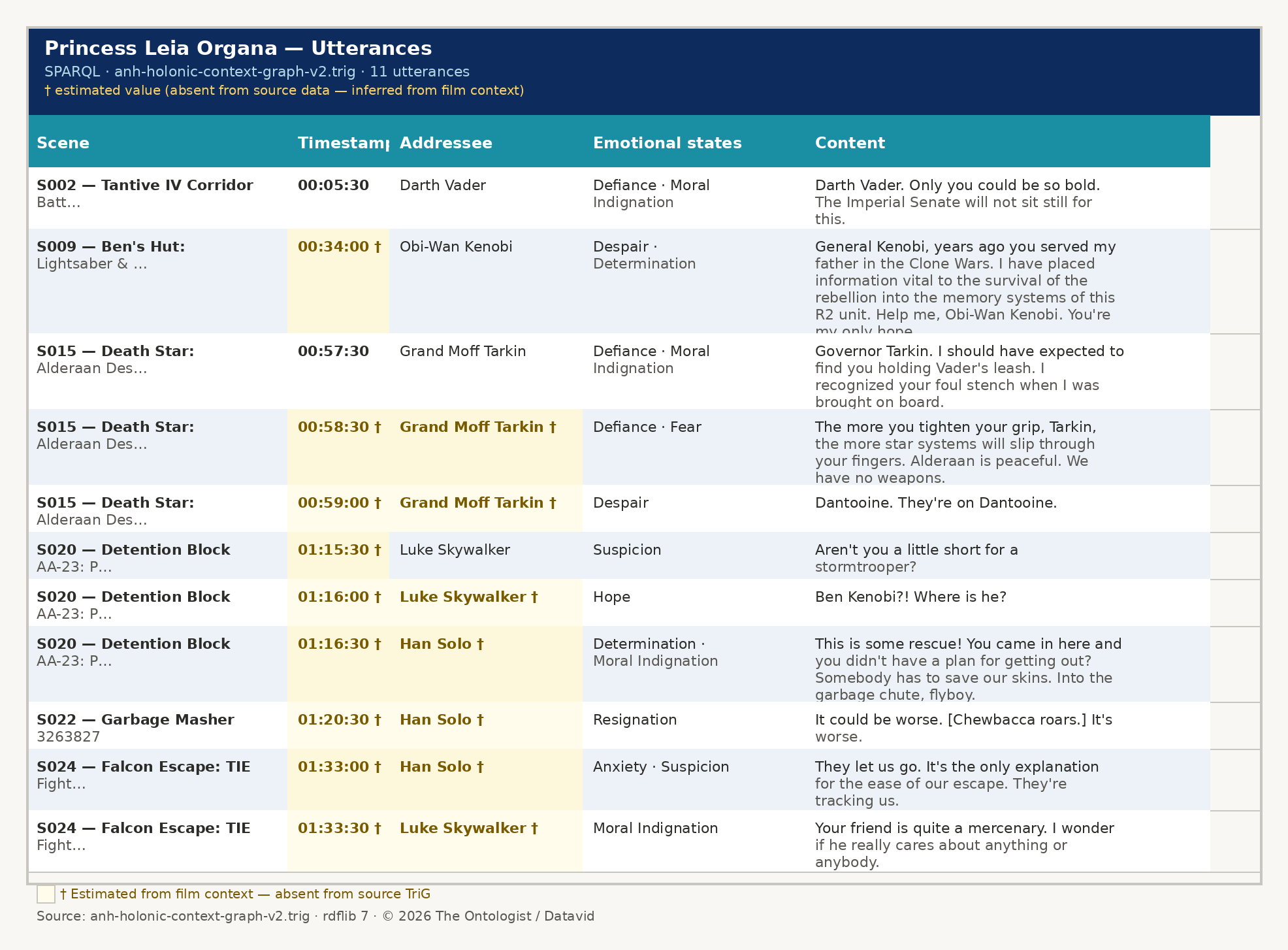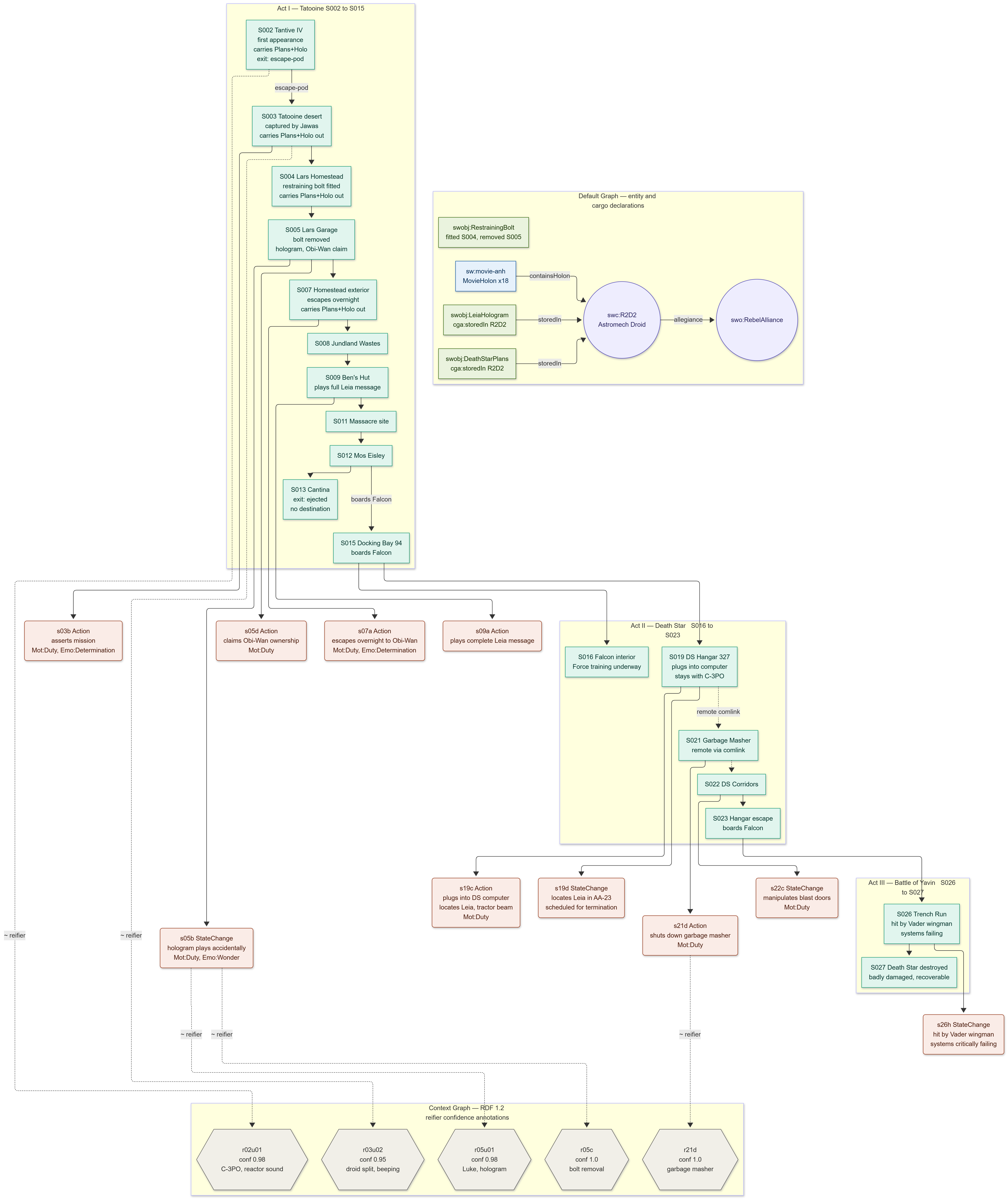 Given the attached SHACL, create a context graph of this section of the movie, with each holon generally indicating a scene change, and with the movie itself being a holon. At each point when a character, place, change of scene, concept or so forth is introduced (moves into the boundary of the holon event) create a declaration for that entity. A scene is defined as the bounded immediate system in which the characters or other entities (such as space ships) interact, with breaks from one holon to the next creating new holons that reference the previous holon if significant factors (typically place) remains the same, and with references to previous holon events . Holons should incorporate context graphs (the description of where things are for the movie or scene in terms of entities), interior graphs for entities that need them, boundary graphs describing SHACL constraints and shapes on the boundary interface, and projection graphs that describe the generated appearance of entities based either as static constructs, or as generated triples. These should use SHACL 1.2 as defined at https://www.w3.org/TR/2026/WD-shacl12-core-20260319/, and should use ~ {| |} reification notation as part of the TURTLE 1.2 specification. Log all events in which entities enter or leave the holon boundaries. Utterances and actions similarly are events that can refer to previous utterances or events indicating inResposeTo or influenceBy, with these utilising named reifications. Motivation, changes of movement, emotional states, topical themes, etc., can be added as annotations, with degrees of confidence and indications of who or what made these evaluations, using Wikidata as reference term ontologies. If timestamps are provided in the transcript, incorporate them as metadata, otherwise estimate them based upon the length of utterances. The desired end product should be a Turtle/Trig document indicating named graph holons in the four holon model.