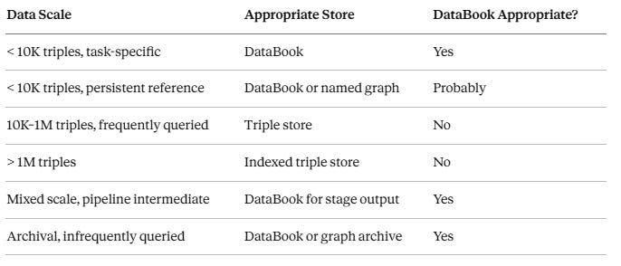 DataBooks are not a replacement for indexed triple stores. For large, frequently queried, persistent graph data — enterprise knowledge graphs, public Linked Data endpoints, production ontology services — a proper triple store with SPARQL endpoint remains the right tool. DataBooks serve the small-data niche that triple stores systematically over-engineer.