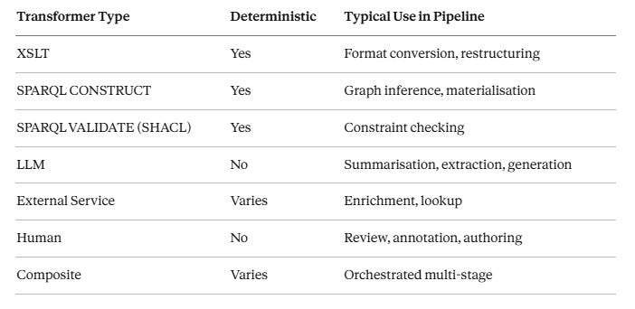 ---This makes LLM outputs composable: the output DataBook can be the input to a subsequent SPARQL validation stage, an XSLT rendering stage, or another LLM stage. It makes them archivable: the DataBook can be stored and retrieved by URL. And it makes them auditable: the process stamp records what transformer operated on what inputs at what time.