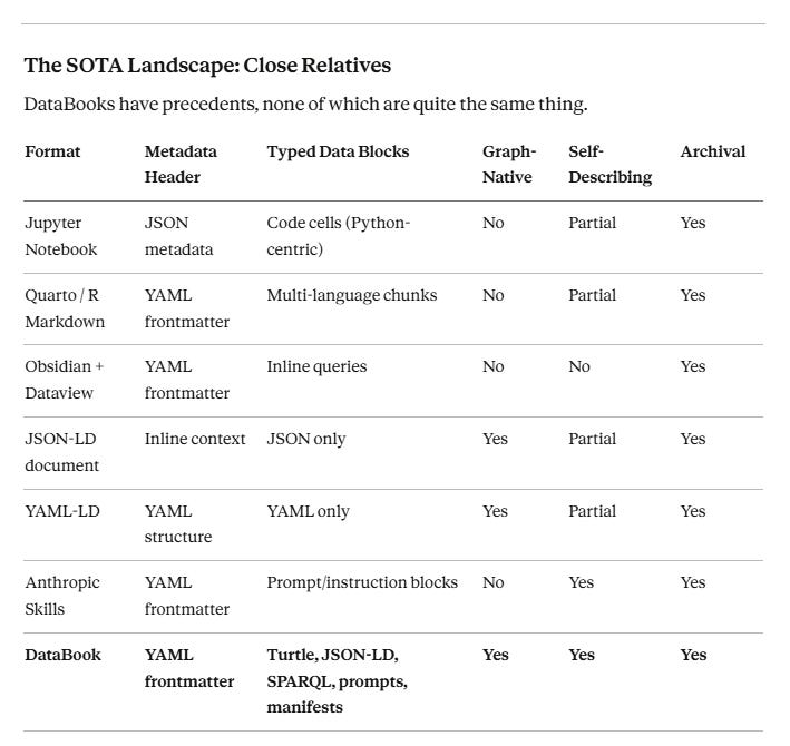 What DataBooks are is a pattern worth adopting now, in anticipation of the specification work. The core elements — YAML frontmatter, typed fenced blocks, process stamps, IRI-based identity — are implementable today with existing tools. The value is available before the standard exists.