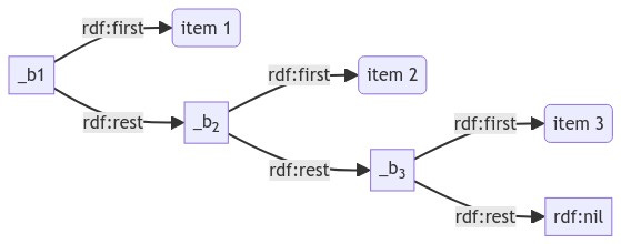 ( :item1 :item2 :item3 )This notation has two advantages. First, it preserves the order of the list, something that a set doesn’t generally do. Additionally, the first blank node in the linked list (_:b1 here) serves as a pointer to the list. This means that by passing _:b1 you are passing what amounts to a list or array of items by reference.
