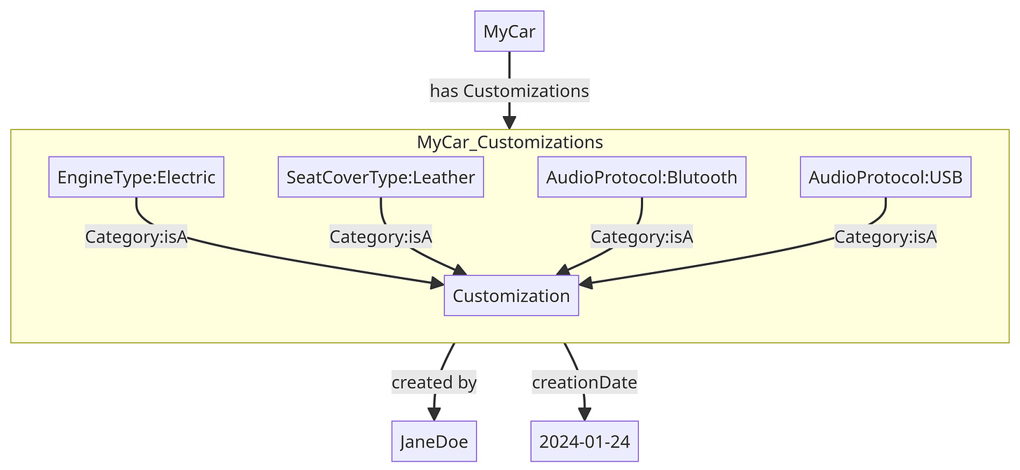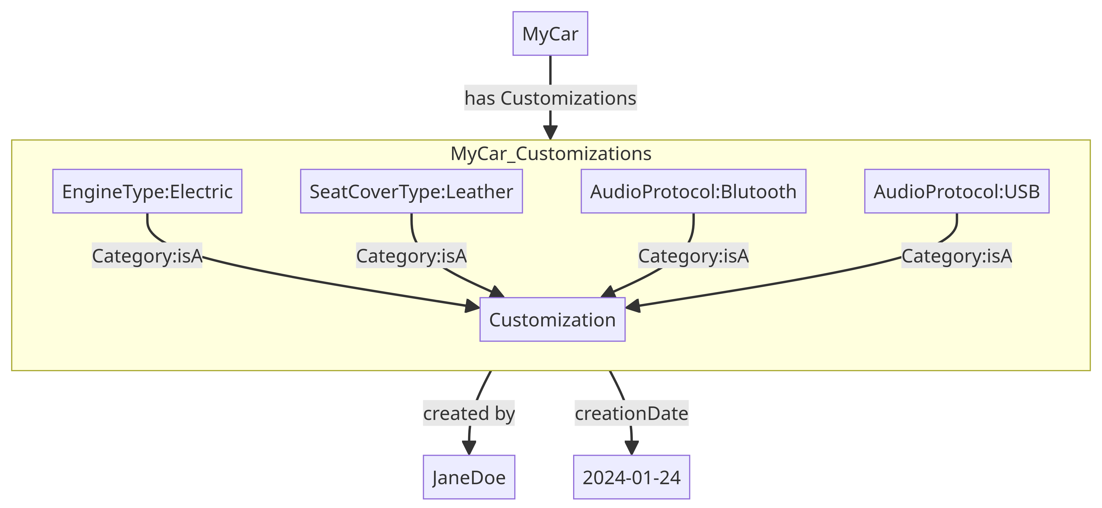 This way, the part types are contained in a graph Graph:MyCar_PartTypes that uses the Category:isA property to identify the respective resources as being of the PartType: class.