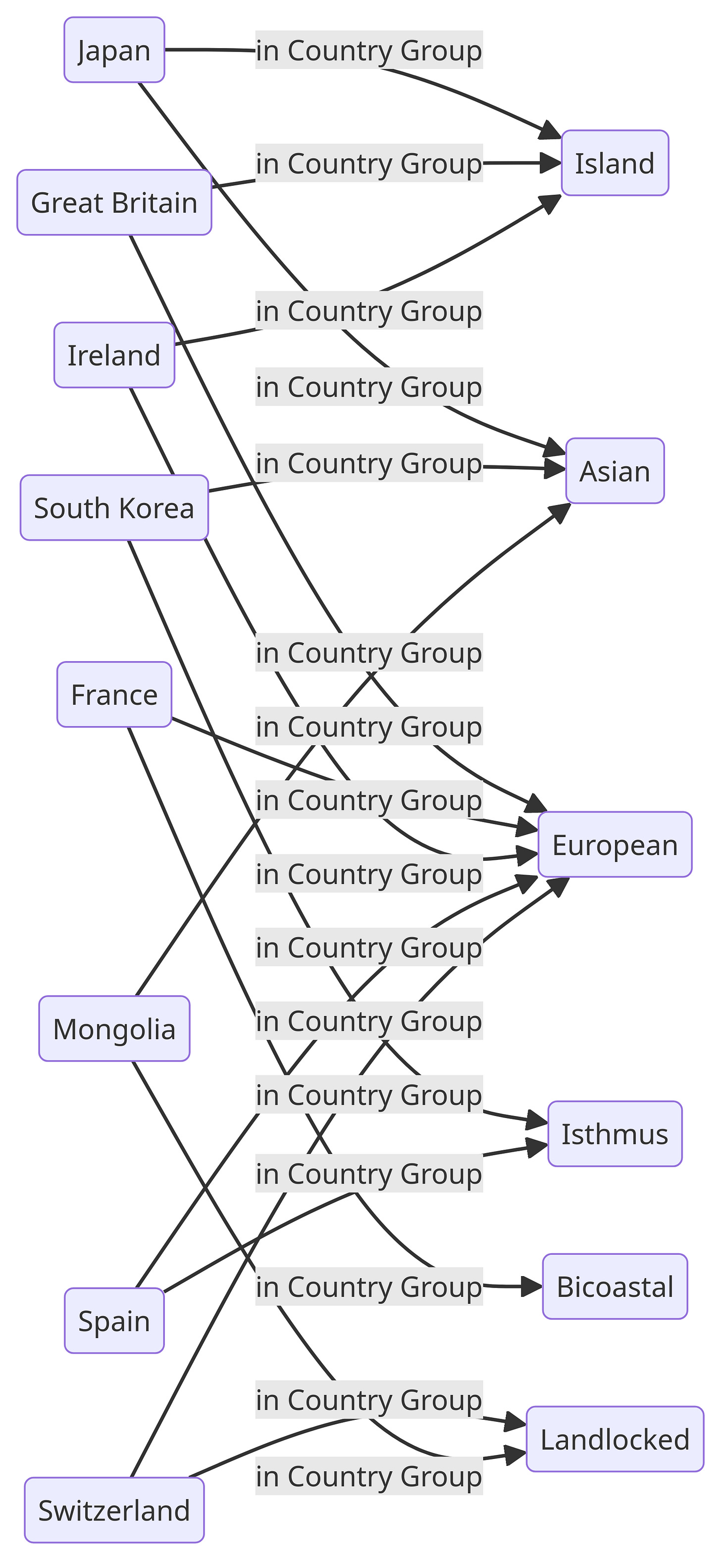 CountryGroup:Asian,CountryGroup:Landlocked.This is a hypergraph on the object side, because each country has more than one foreign key pointer. This is also a common design pattern where you have multiple tags that can be associated with a given concept. It should be noted, though, that if these tags are enumerations, such as the ones given above, there may, in fact, be some kind of underlying structure that is hidden in this model. For instance, the same information may also be stated as follows: