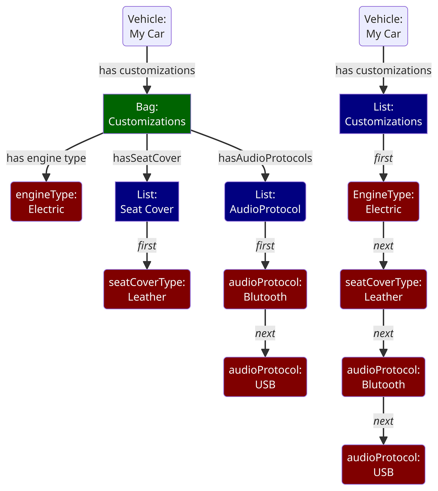 This is what makes lists so tricky. A list can be considered a pseudo-element, requiring a certain amount of additional processing and conditional logic when querying, but can be thought of as being of the same type as its constituent items. what changes is the shape of the connection? In SHACL, this would look something like: