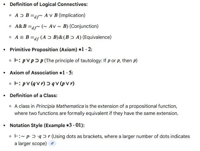 OWL, on the other hand, had its antecedents in the symbolic logical systems used in mathematics, which in turn dates back to the Principia Mathematica, written by Bertrand Russell and Alfred North Whitehead from 1910 to 1913. This work was significant both because it helped formalise much of the mathematical notation of the time, and because it was, in its own way, a precursor to much of the computing theory that would dominate over the next century. A sample of its contents, though, illustrates the fact that it was a fairly dense slog to understand, especially as much of it was built around set theory and propositional calculus: