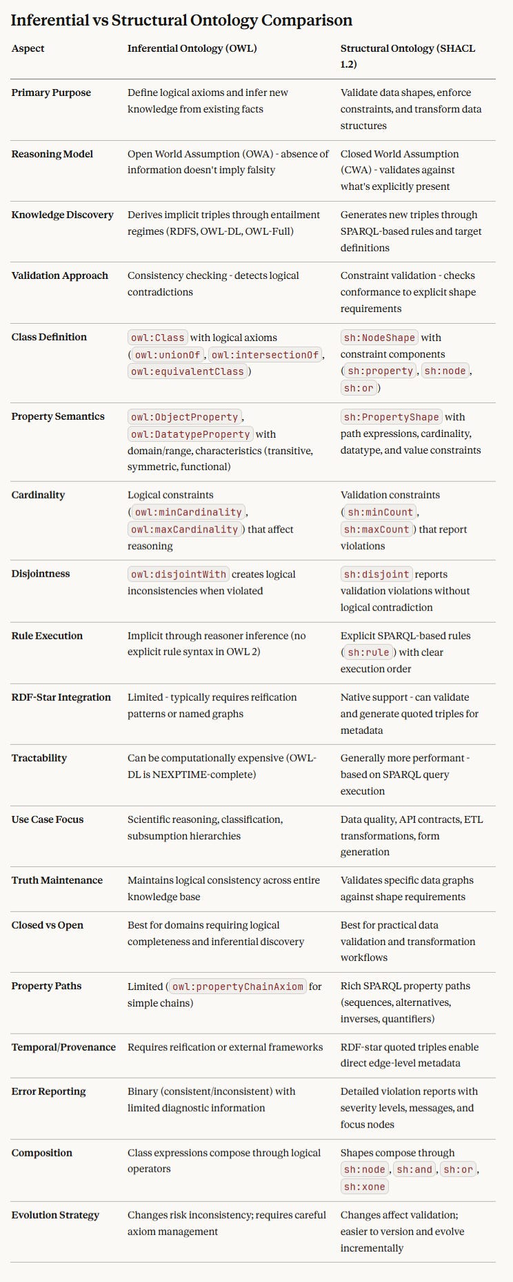 One thing I’ve been emphasising of late is the importance of SHACL 1.2 from a structural standpoint rather than an inference standpoint (as in OWL). These aren’t the same, though they overlap somewhat, and they indicate why SHACL may be better suited to application development, particularly for the generative use of LLM code generators.