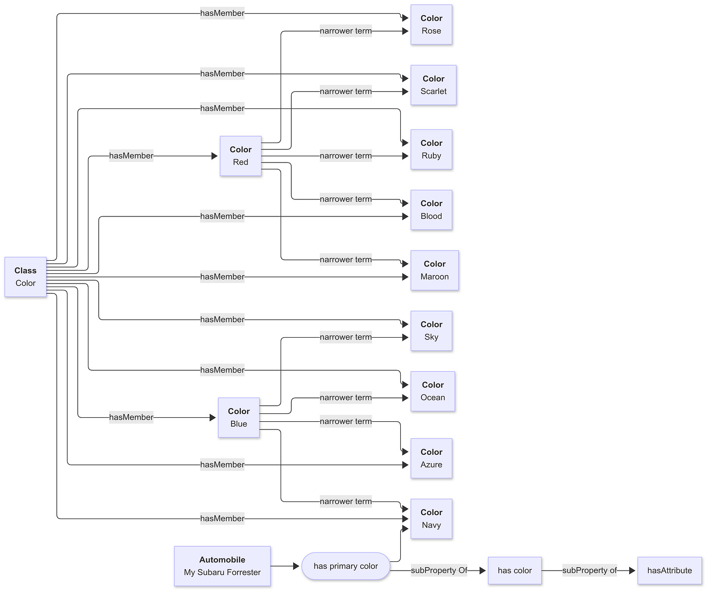 }This says, assuming the test colour is blue, find the automobile that has the primary colour that is either blue or some narrow term of blue, such as navy. That is a reasonably quick query involving only three edges, but it does require knowledge about the model.