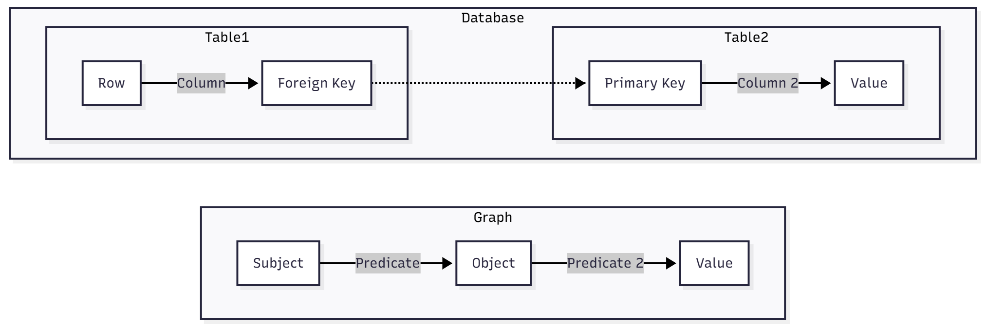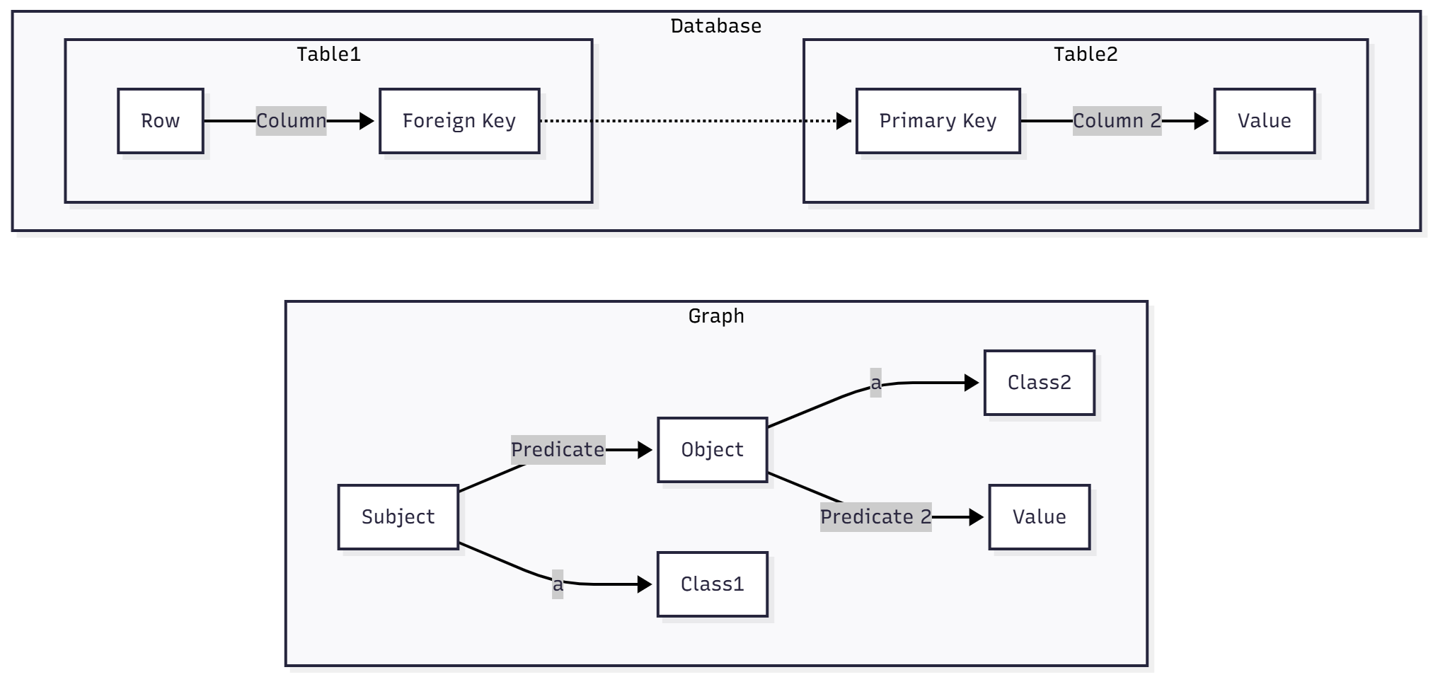 In database parlance, the link between a foreign key and a primary key is called a join. Such joins can give the illusion that you have several tables with large numbers of columns that repeat with each variation of the joined table. In the RDF world, on the other hand, there is no table - the object of one triple becomes the subject of another.