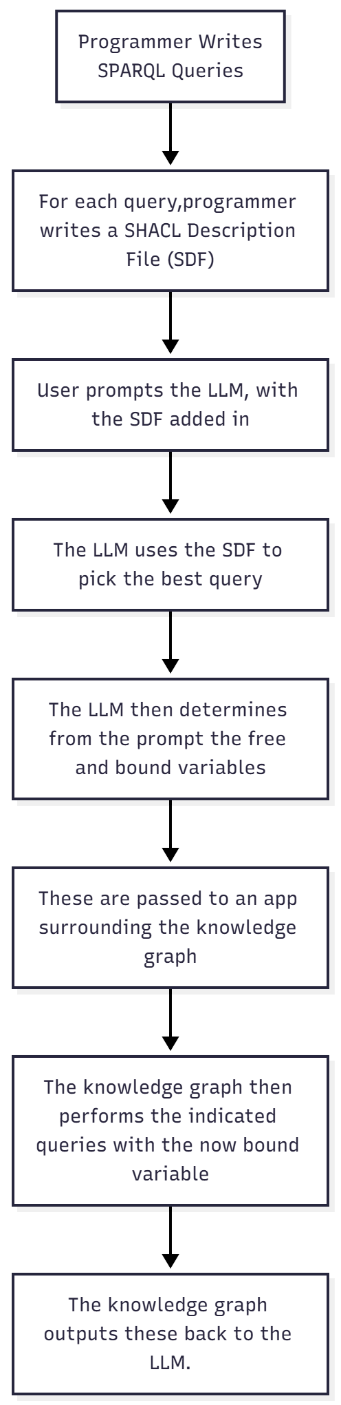 There are two ways to accomplish Step 2 (LLM Converts prompt to query). The first is to have the LLM write a SPARQL query that takes the requested input and queries it. This approach is powerful but often really hard to pull off in practice because it requires the LLM to have a full understanding of the graph's structural ontology (which, perforce, requires loading the ontology into the context).