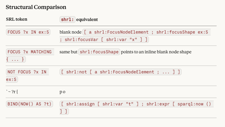 The shrl: serialisation is significantly more verbose than SRL for the same semantics — which is expected, since it is the machine-readable form intended for tooling rather than human authoring. The SRL text file is the authoring surface; the shrl: Turtle is what processors consume after parsing.