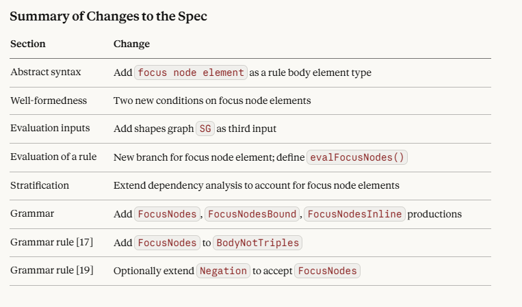 SHACL rules, at least in theory, perform reasoning on specific datasets (including the enumerated focus nodes). In point of fact, we’re not quite there yet, and it can be argued that SHACL rules are fired whenever a containing node shape is processed. I expect this will become clarified over the next year, because with it, SHACL effectively creates the equivalent of a reasoner.