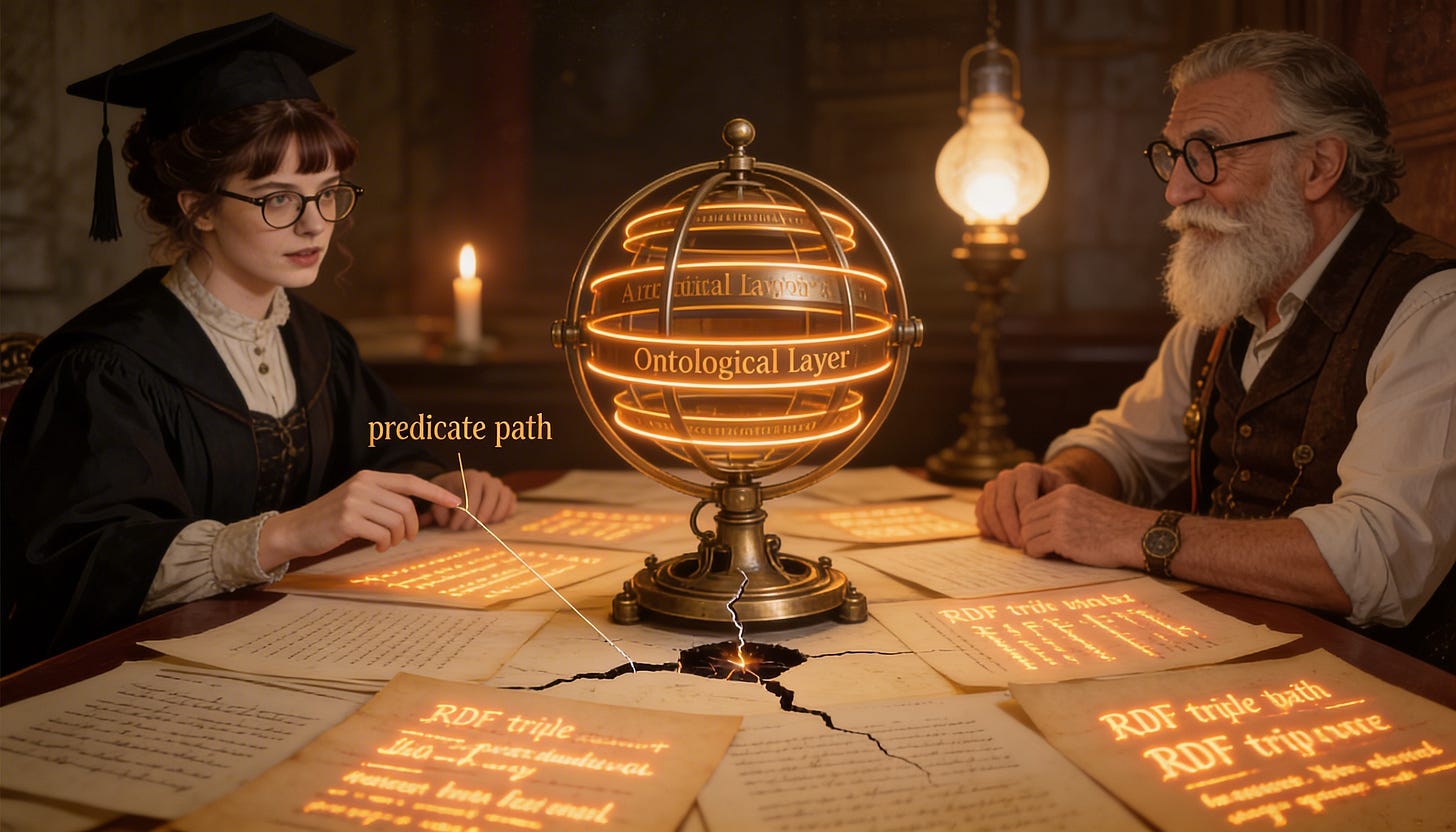 There is a deeper problem underneath the class proliferation, and it runs throughout most applied ontology work. In formal logic, a predicate is a relation — it holds between terms under given conditions. A property in the OWL/RDF tradition is treated as a functional attribute — something an entity has, with a value. These are not the same thing, and the RDF data model, by representing both as binary directed triples, systematically obscures the difference.