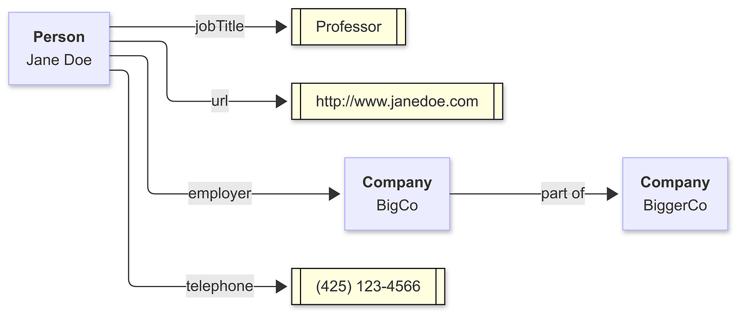 This is a graph. One statement of that graph is that a person has an employer (specifically, Jane Doe has the employer BigCo, a very big, very important company, trust me on this). Jane Doe is the subject, BigCo is the object, and “employer” is the predicate or relationship. BigCo may very well have either in-bound or out-bound arrows attached to it.